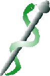 | 医療の神として描かれることが多いのはアスクレピオスで、1匹 の蛇が絡まった杖を象徴として用います。 またヘルメスも医神と言われ、その杖(カドウケス)には2匹の 蛇が絡められています。 |